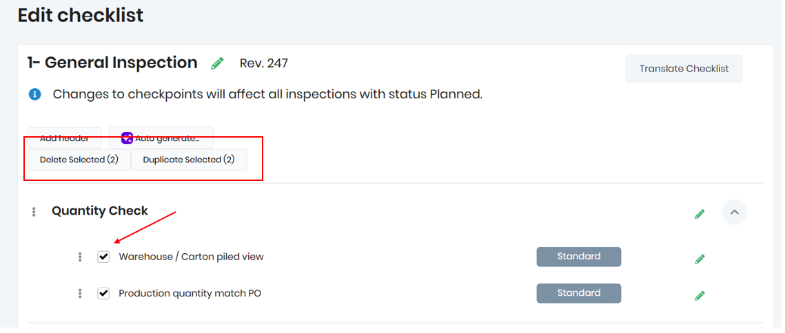 The checkboxes next to the checkpoints can be used to Delete Selected and Duplicate Selected checkpoints: