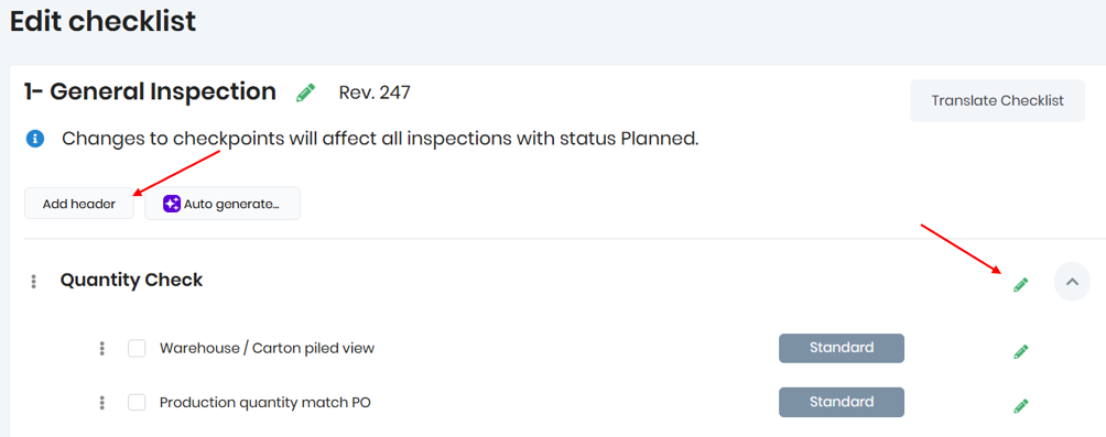 This guide briefly explains how to edit existing checklists. Checklists consist of Headers and Checkpoints. The headers can be used to organize the checkpoints into sections, as shown below: In this example, there are three sections in the checklist. Clicking on a section title will expand and collapse it to show the checkpoints inside.