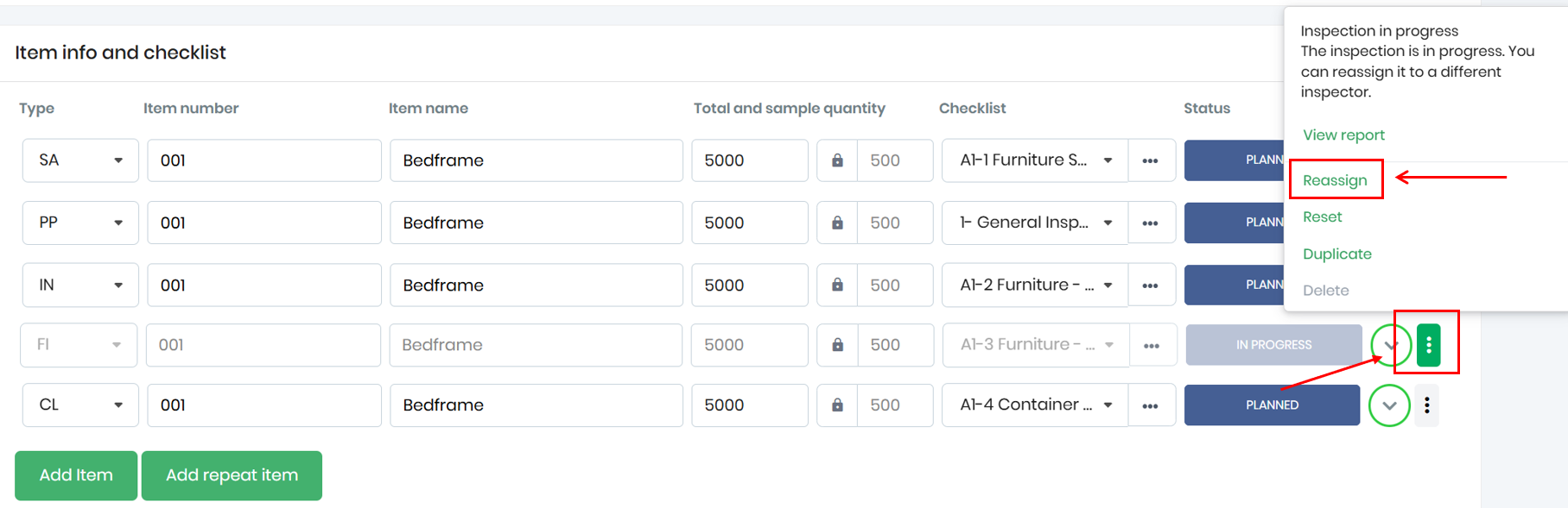 Select the inspection you want to reassign and click the three small dots. Next, click on Reassign to assign another user:
