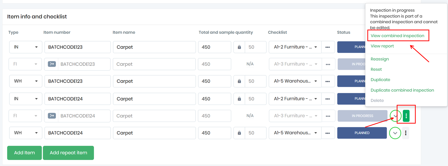 If the inspection is a combined inspection, click View combined inspection: