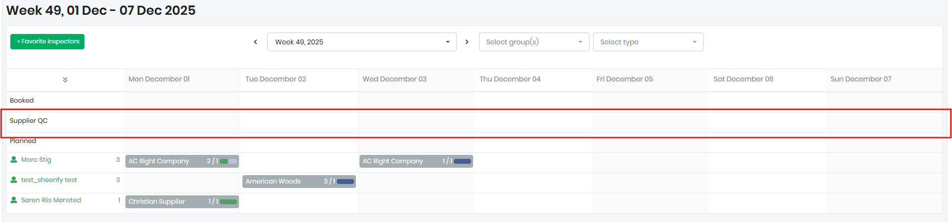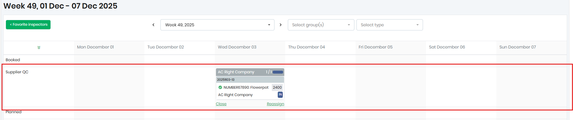 In the Week view, there is a Supplier QC row, which enables assigning the inspection by "Drag and drop" to the Supplier QC row: