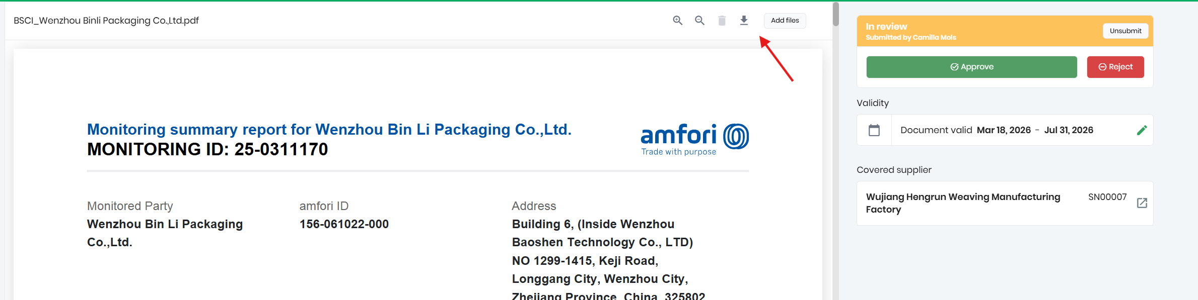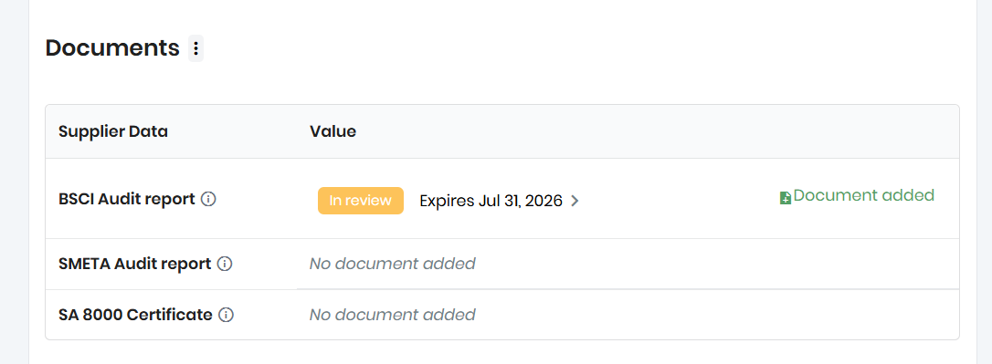 During an audit it possible to collect documents on supplier and production unit level. Once the supplier documents are set up, customers can control if there should be an approval flow per document type.