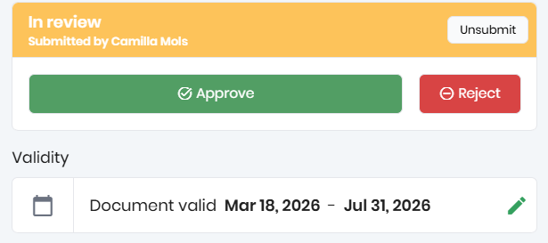 Once document is reviewed validity can be changed and document can be approved or rejected. If approved, the document will be linked to the supplier in valid status until expiry date. If the document is rejected it will keep that status until a new document is added