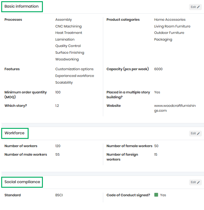 Giám định và Đánh giá nhà cung cấp là một công cụ quản lý chuỗi cung ứng, được sử dụng để thu thập, xác minh và quản lý dữ liệu của nhà cung cấp và đơn vị sản xuất. Trong công cụ này, mỗi nhà cung cấp và đơn vị sản xuất có một trang thông tin riêng, bao gồm các trường dữ liệu tùy chỉnh (custom fields). Đây là nơi bạn có thể lưu trữ các thông tin bắt buộc về nhà cung cấp hoặc đơn vị sản xuất. Những thông tin này có thể là các dữ liệu cơ bản như địa chỉ, thông tin liên hệ, hoặc cũng có thể là những thông tin về hoạt động, chứng nhận, cơ cấu sử dụng năng lượng, v.v.