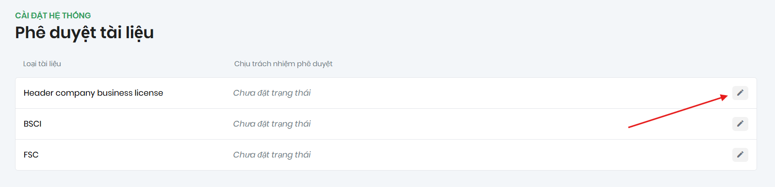 Nếu bạn có đủ quyền cần thiết để thiết lập luồng phê duyệt, hãy nhấp vào nút "Chỉnh sửa" bên cạnh loại tài liệu tương ứng.