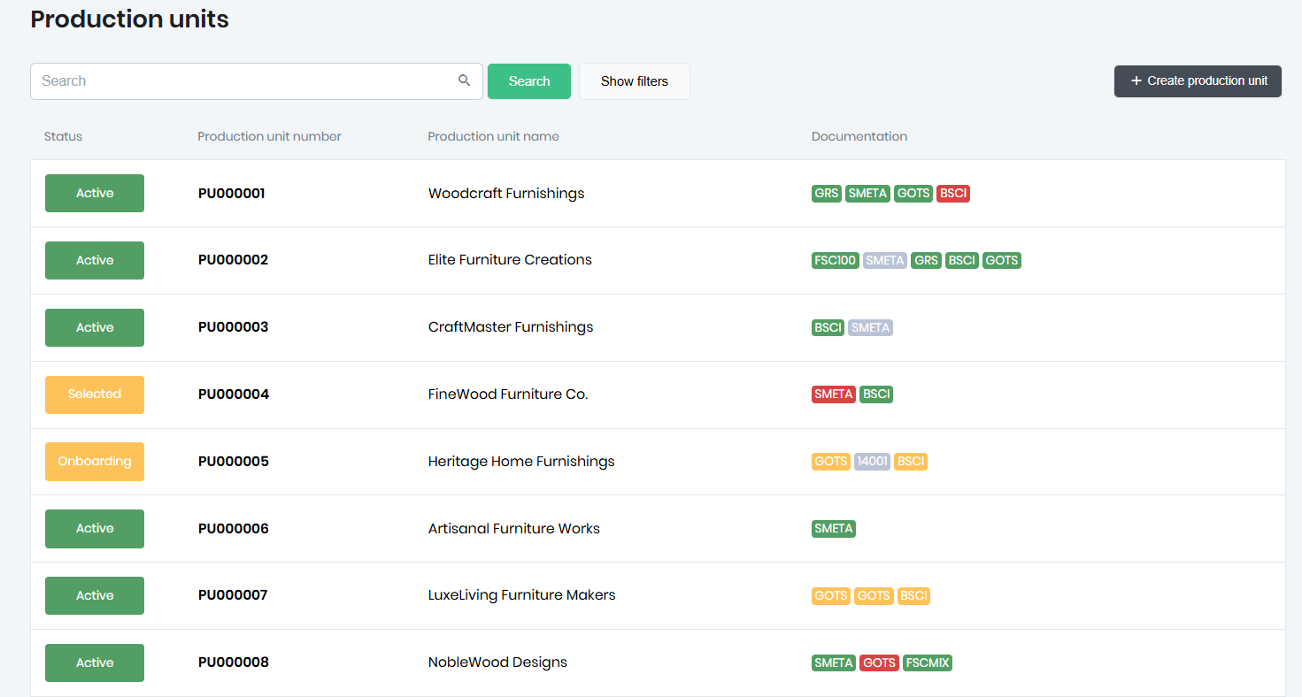 Bạn có thể xem tổng quan đầy đủ về các đơn vị sản xuất và trạng thái hiện tại của chúng bằng cách điều hướng đến Chuỗi cung ứng > Đơn vị sản xuất. Nếu tài khoản của bạn đã bật tài liệu nhà cung cấp, bạn cũng có thể xem các tài liệu liên quan trong cùng mục, cung cấp cho bạn cái nhìn tổng quan về cả tài liệu và trạng thái đơn vị sản xuất.