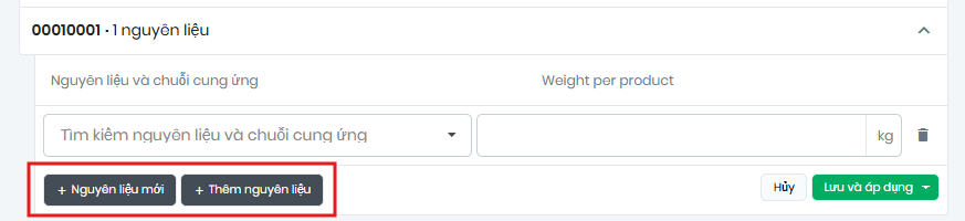Nhấp vào mục này để mở rộng khu vực vật liệu và “Thêm nguyên liệu” lần đầu tiên để tạo chuỗi cung ứng vật liệu hoặc nhấn “+ Nguyên liệu mới” nếu bạn muốn tạo thêm chuỗi cung ứng vật liệu cho sản phẩm hiện có.
