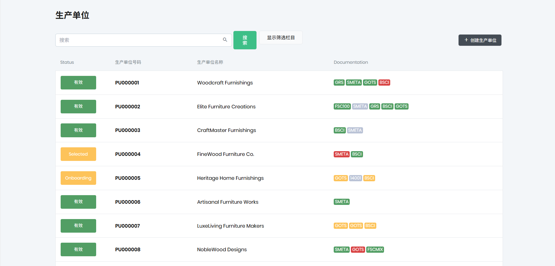 您可以通过导航至 “供应链> 生产单位”,全面了解所有生产单位及其当前状态。如果您的账户已启用供应商文档功能,在同一板块还能查看相关文档,从而同时掌握文档信息与生产单位状态。